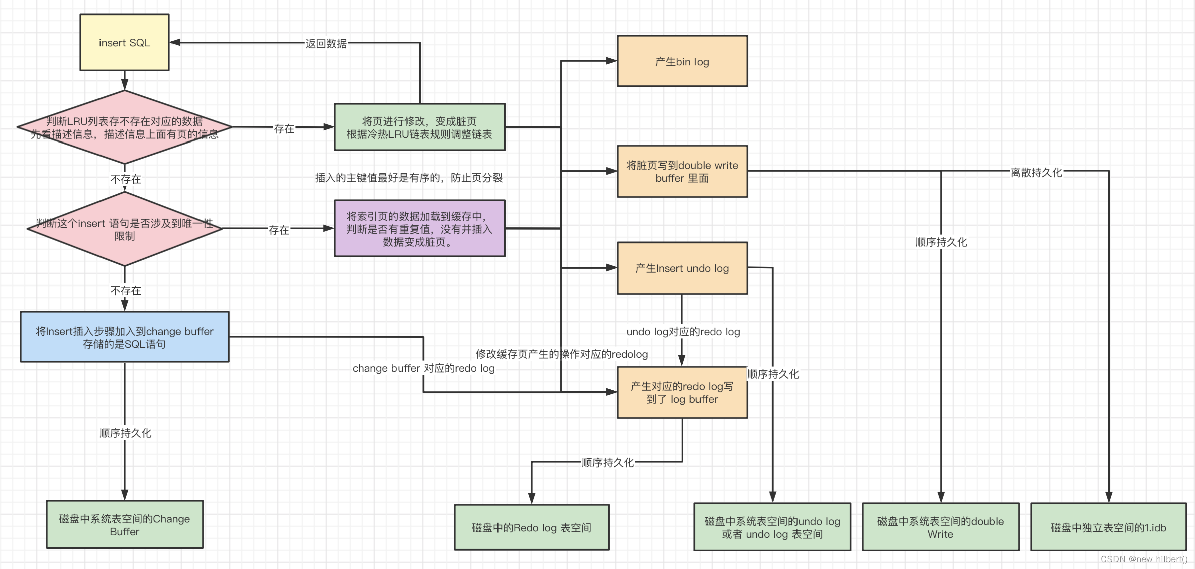- 如果不存在,则判断这个insert 语句是否涉及到唯一性限制。如果存在,将索引页的数据加载到缓存中,判断是否有重复值,没有重复数据就插入数据,使得其变成脏页。
